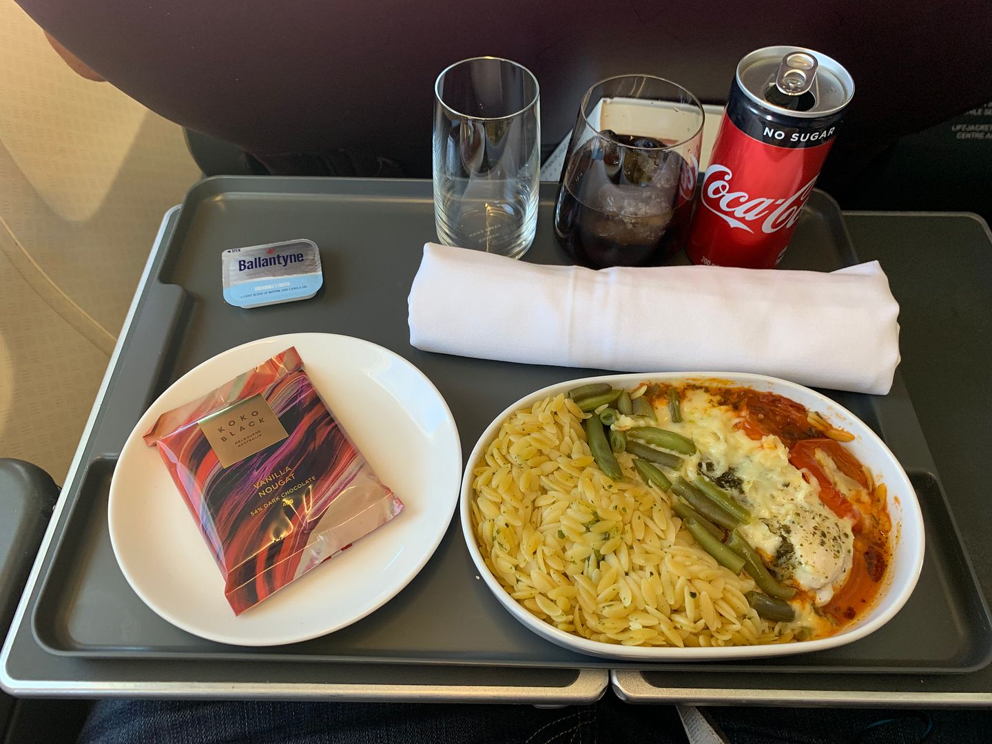 Forgot to snap the menu. Food was described as lunch, despite 3pm departure and close to 9pm arrival. Was a bit disappointed that the menu offered only one dish plus dessert. Options were soup, seared tuna nicoise, crumbed chicken roll, pork chop, and a grain salad. A deliberately light menu? Perhaps tailoring more for pax coming from LHR.
